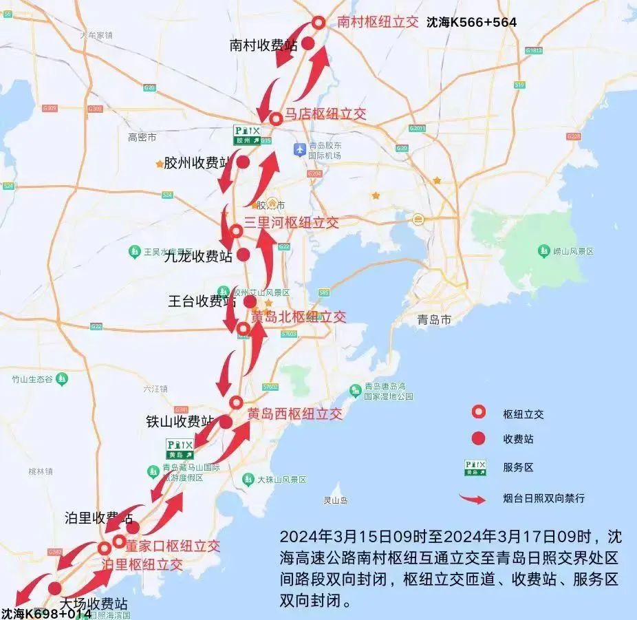 3、馬店樞紐立交(G20青銀高速公路)、三里河樞紐立交(S24青商高速公路)、黃島北樞紐立交(G22青蘭高速公路)、黃島西樞紐立交(S7602疏港2號高速公路)、董家口樞紐立交(S30董梁高速公路)、泊里樞紐立交(S21明董高速公路)駛往G15沈海高速公路煙臺(tái)、日照方向車輛無法通行,匝道全部封閉;南村樞紐立交(G2011青新高速公路)駛往日照方向匝道封閉。