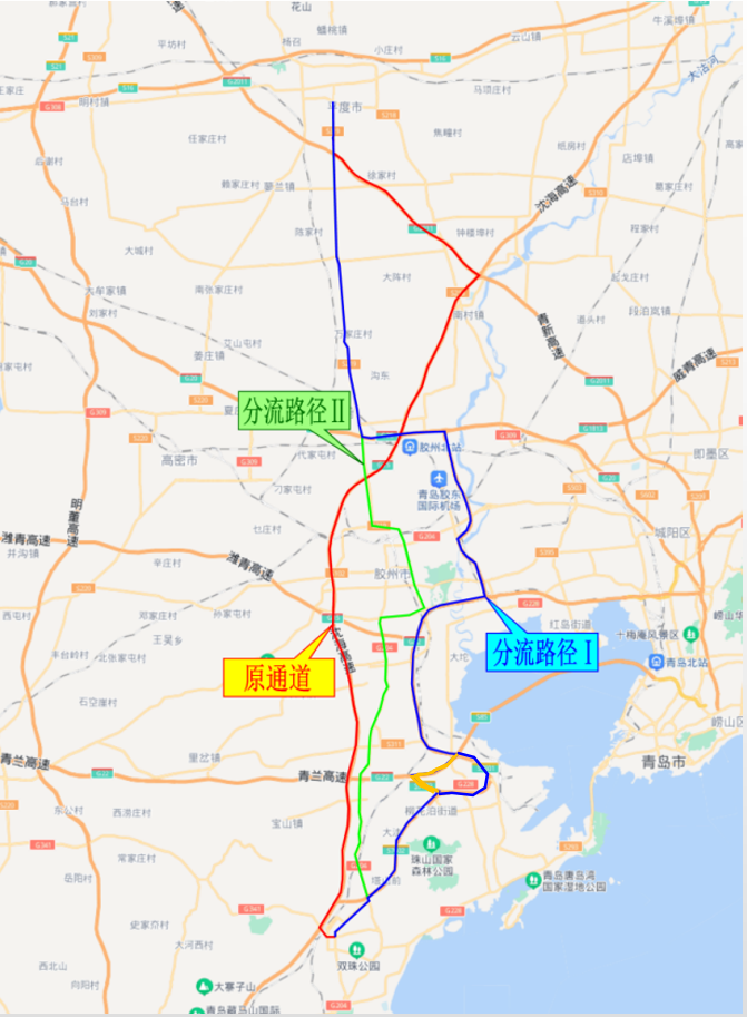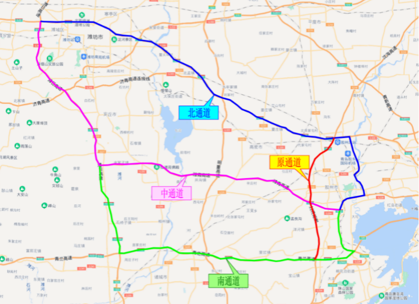 利用青銀高速、濰青高速、濰日高速、青蘭高速為濰坊至青島的分流路徑。