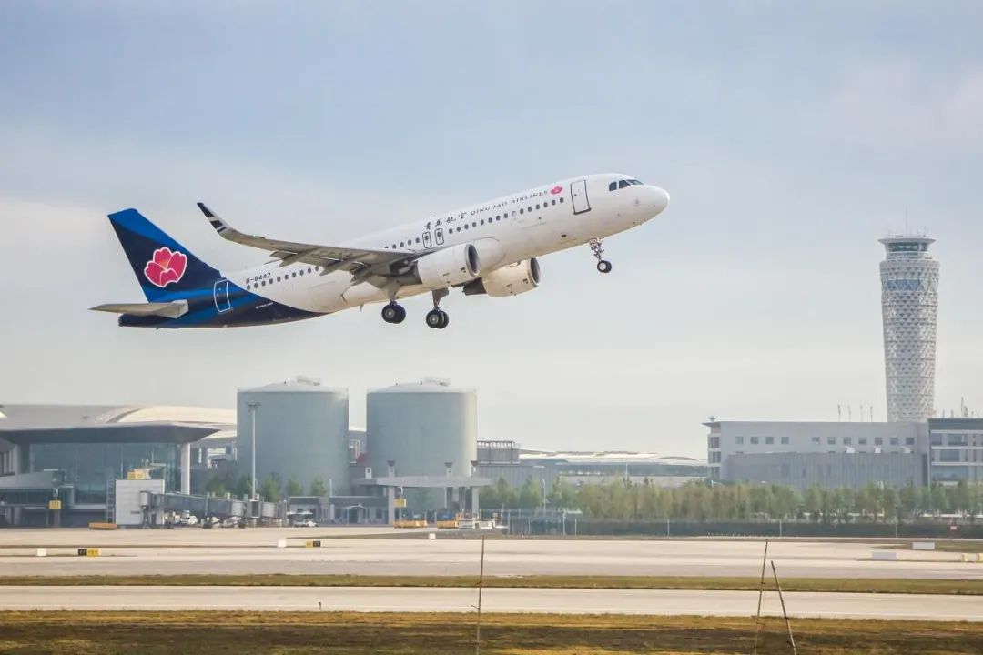 (青島航空飛機從青島膠東國際機場起飛)