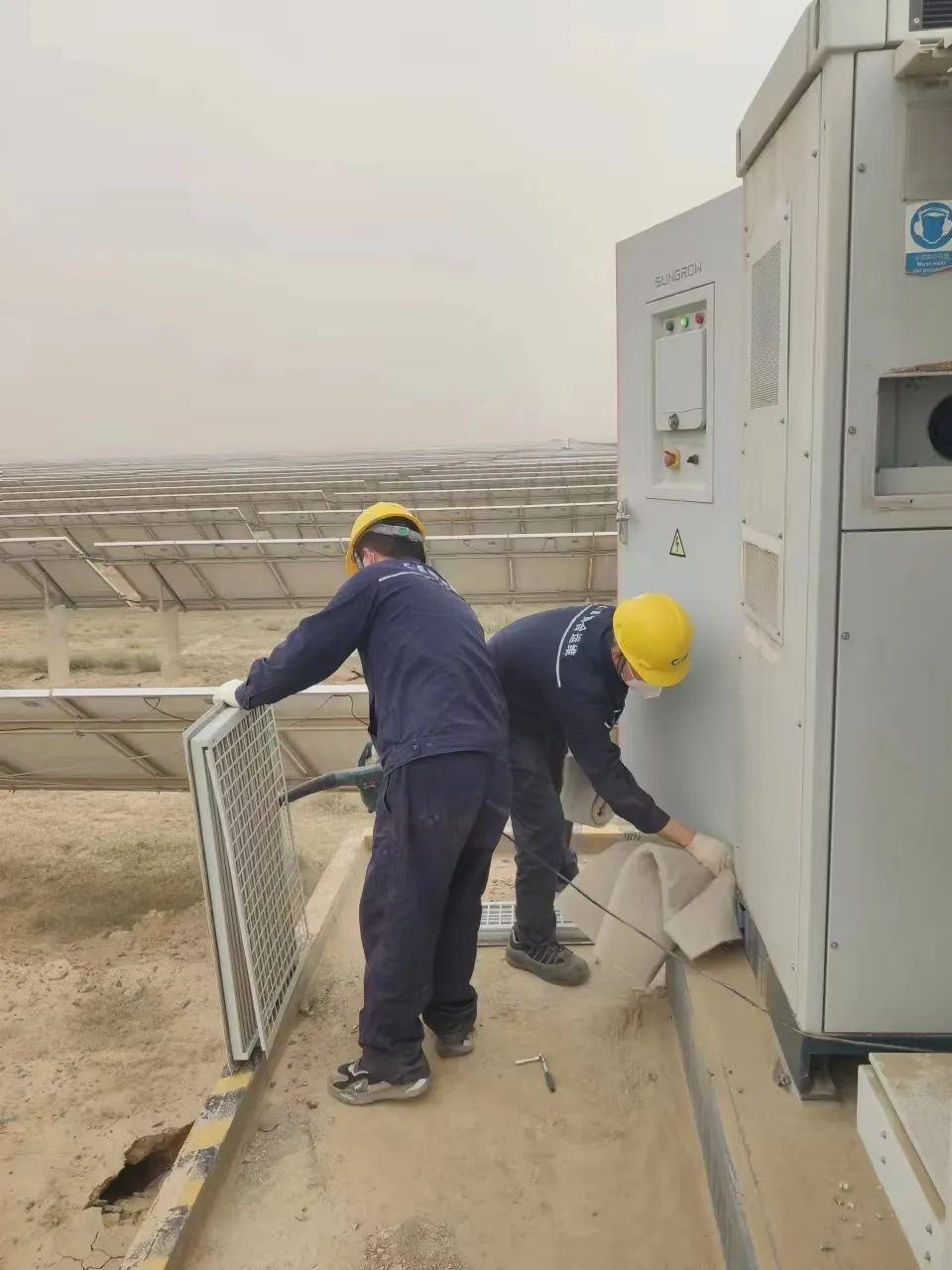 沙塵天氣過后,為提高發(fā)電效率保證年底發(fā)電量按時(shí)完成,新能源集團(tuán)組織人員對(duì)木壘項(xiàng)目開展逆變器清灰工作,加強(qiáng)運(yùn)行監(jiān)護(hù)、及時(shí)調(diào)整參數(shù),確保設(shè)備在最優(yōu)狀態(tài)下穩(wěn)定運(yùn)行。