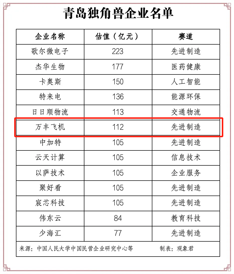 青島城投投資企業(yè)萬豐飛機蟬聯(lián)全球獨角獸企業(yè)500強