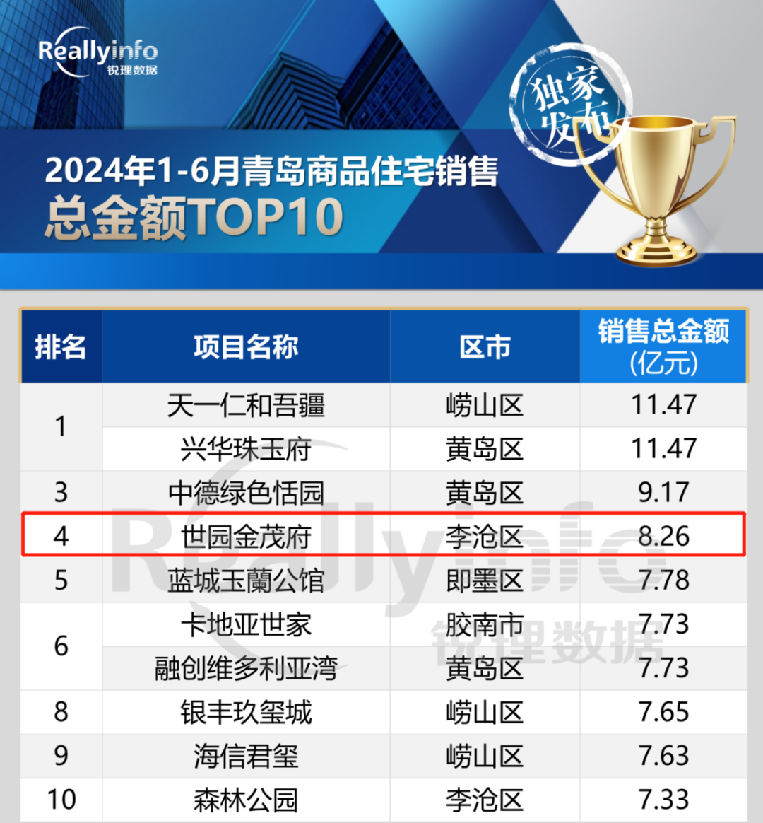 近日,銳理數(shù)據(jù)發(fā)布“青島房市年中榜”,青島城投集團世園·金茂府以8.26億銷售總金額榮登青島市2024上半年網(wǎng)簽金額第四名,穩(wěn)居李滄區(qū)第一名。