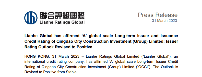 青島城投再獲聯(lián)合國際“A”境外主體評級,展望調(diào)整至正面