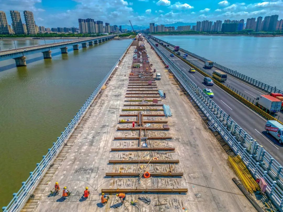 (圖為女姑口跨海特大橋舊橋橫向拼接施工現(xiàn)場)