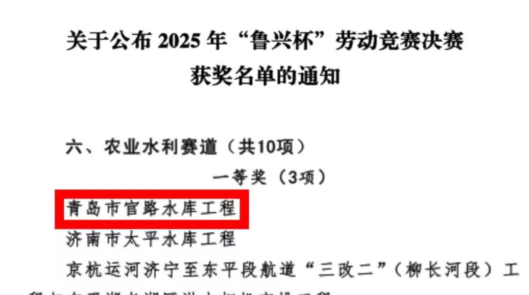青島官路水庫工程榮獲山東省“魯興杯”勞動競賽決賽一等獎
