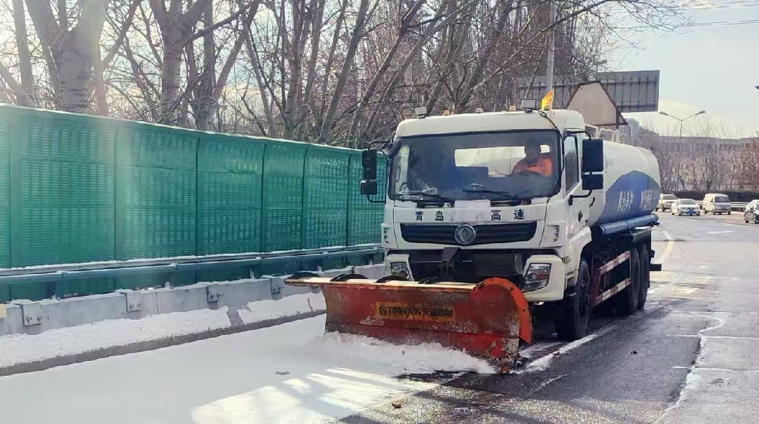 1月8日至9日,青島市中北部地區(qū)及市區(qū)東部范圍內(nèi)出現(xiàn)冷流降雪,青島城投集團旗下青島高速所轄青銀高速、青新高速、沈海高速、龍青高速等多個交通主干道被雪覆蓋。此次降雪具有分散性高、短時降雪量大的特點,為有效應(yīng)對可能出現(xiàn)的積雪及結(jié)冰問題,青島高速以雪為令,第一時間啟動除雪防滑應(yīng)急預(yù)案,科學制定除雪防滑措施,多措并舉保障通行安全,打響2025年除雪保暢“第一仗”。(圖為推雪鏟車在青銀高速流亭立交匝道對應(yīng)急車道進