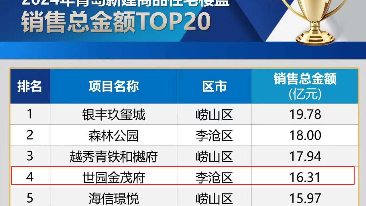 近日,2024年青島市商品房銷售榜單正式發(fā)布,青島城投集團世園·金茂府項目以16.31億元銷售總金額榮登2024年青島新建商品住宅樓盤銷售金額榜第4名,超額完成全年銷售目標任務(wù)。(圖為青島銳理數(shù)據(jù)截圖)世園·金茂府是青島城投集團與金茂集團聯(lián)合打造的標桿型人居產(chǎn)品,占地160畝,規(guī)劃地上建筑面積20.89萬平方米。項目自2023年1月開盤以來,便備受市場關(guān)注。(圖為世園·金茂府項目)項目位于4A級景區(qū)世博園內(nèi),對望百果山,五縱