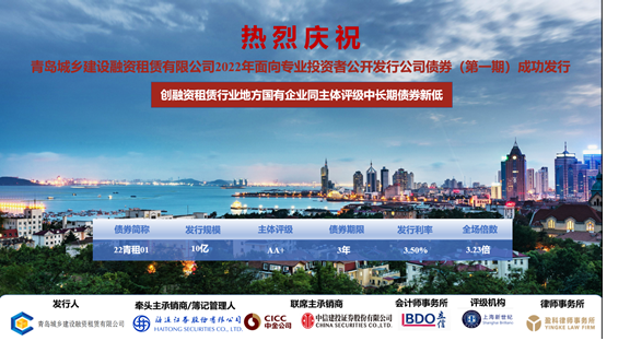 2022年2月25日,金控集團融資租賃公司(以下簡稱“租賃公司”)2022年面向?qū)I(yè)投資者公開發(fā)行公司債券(第一期)成功發(fā)行,金額10億元。(圖為發(fā)行公告)本期公司債發(fā)行主承銷商為海通證券股份有限公司,聯(lián)席主承銷商為中國國際金融股份有限公司和中信建投證券股份有限公司,采取簿記方式發(fā)行,簿記期間獲得眾多投資者的認可,最終發(fā)行利率3.5%,全場倍數(shù)3.23倍,發(fā)行利率創(chuàng)融資租賃行業(yè)地方國有企業(yè)同主體評級中長期債券新低