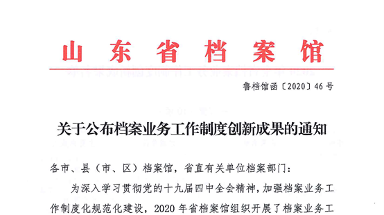 2020年12月22日,山東省檔案館《關(guān)于公布檔案業(yè)務(wù)工作制度創(chuàng)新成果的通知》(魯檔館字〔2020〕46號)正式發(fā)布,集團(tuán)所屬5家單位榮獲山東省檔案業(yè)務(wù)工作制度創(chuàng)新成果三等獎,分別是青島城投文化產(chǎn)業(yè)有限公司、青島(萊西)城鄉(xiāng)社區(qū)建設(shè)投資有限公司、青島城投資產(chǎn)管理有限公司、青島城鄉(xiāng)建設(shè)小額貸款有限公司、青島城投地產(chǎn)投資控股(集團(tuán))有限公司。