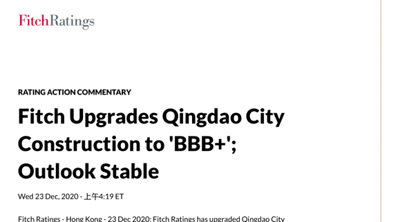 惠譽(yù)國際評級12月23日正式宣布,確認(rèn)集團(tuán)長期外幣及本幣發(fā)行人主體評級從“BBB”上調(diào)至“BBB+”,展望“穩(wěn)定”?;葑u(yù)認(rèn)為,集團(tuán)與青島市政府的關(guān)系進(jìn)一步加強(qiáng),將代表政府持有更多具有戰(zhàn)略性的重要資產(chǎn)。