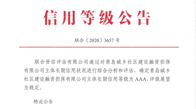 9月17日,聯(lián)合資信評(píng)估有限公司(下稱(chēng)“聯(lián)合資信”)發(fā)布信用等級(jí)公告(聯(lián)合〔2020〕3657號(hào)),通過(guò)對(duì)青島城鄉(xiāng)社區(qū)建設(shè)融資擔(dān)保有限公司(下稱(chēng)“城鄉(xiāng)擔(dān)保”)主體長(zhǎng)期信用狀況進(jìn)行綜合分析和評(píng)估,確定公司主體長(zhǎng)期信用等級(jí)為AAA,評(píng)級(jí)展望為穩(wěn)定。金控集團(tuán)城鄉(xiāng)擔(dān)保公司成為目前山東省首家AAA融資擔(dān)保機(jī)構(gòu)。